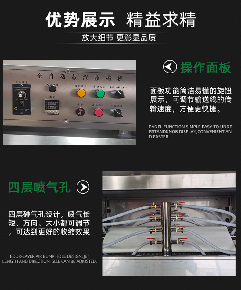• 操作簡便:配備溫度計及壓力表,蒸汽壓力及收縮溫度一目了然,開機(jī)操作方便 。蒸汽進(jìn)氣閥門裝有刻度盤,節(jié)省每班操作開機(jī)時間,操作人員可以快速準(zhǔn)確地進(jìn)行參數(shù)設(shè)置和調(diào)整,降低了操作難度和培訓(xùn)成本123.