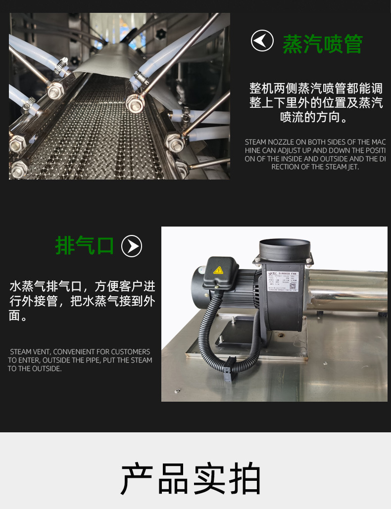 • 蒸汽噴射角度可調(diào)節(jié):整機(jī)兩側(cè)噴管每根都能調(diào)整其上下、里外位置及噴流方向,可根據(jù)產(chǎn)品的形狀、尺寸和包裝要求,精確調(diào)整蒸汽噴射角度,確保蒸汽能夠均勻地覆蓋在產(chǎn)品表面,進(jìn)一步優(yōu)化收縮效果,同時降低瓶身受熱變形的可能123.