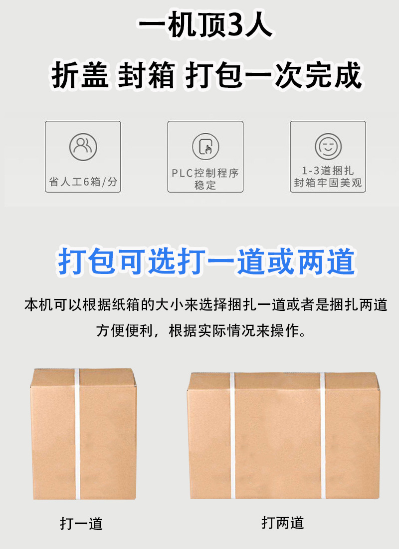 • 由于實(shí)現(xiàn)了高度自動(dòng)化,減少了人工參與封箱打包的操作環(huán)節(jié),從而節(jié)省了大量時(shí)間。原本人工封箱和打包需要花費(fèi)較多時(shí)間來(lái)完成諸如折頁(yè)、貼膠帶、纏繞打包帶等步驟,而機(jī)器可以在短時(shí)間內(nèi)自動(dòng)完成。同時(shí),人工操作容易出現(xiàn)失誤,如膠帶粘貼不牢固、打包帶松弛等,這些失誤會(huì)導(dǎo)致返工,降低工作效率。一字封箱打包機(jī)通過(guò)精準(zhǔn)的機(jī)械控制和自動(dòng)化流程,有效避免了這些人工失誤,保證了包裝質(zhì)量,間接提高了工作效率