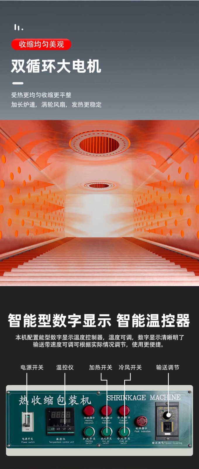 批量生產(chǎn)對設(shè)備的連續(xù)運行能力要求極高,袖口式熱收縮包裝機通過三大設(shè)計確保穩(wěn)定性:其一,采用重型鋼結(jié)構(gòu)機身,搭配精密軸承與耐磨輸送帶,長期運行后機身無明顯晃動,輸送帶磨損率降低 60%,使用壽命可達 3-5 年;其二,搭載進口 PLC 控制系統(tǒng)與伺服電機,核心部件故障率低于 0.3%,可支持 24 小時連續(xù)作業(yè),即使在食品飲料行業(yè) “旺季日產(chǎn) 10 萬瓶” 的高強度生產(chǎn)場景下,也能保持穩(wěn)定運行;其三,配備完善的保護機制 —— 當(dāng)加熱管溫度異常、包裝膜斷膜、輸送帶卡瓶時,設(shè)備會自動切斷電源或暫停運行,并在觸控屏上顯示故障原因,操作人員可快速排查維修,平均停機維修時間控制在 15 分鐘以內(nèi),大幅減少因設(shè)備故障導(dǎo)致的產(chǎn)能損失。
