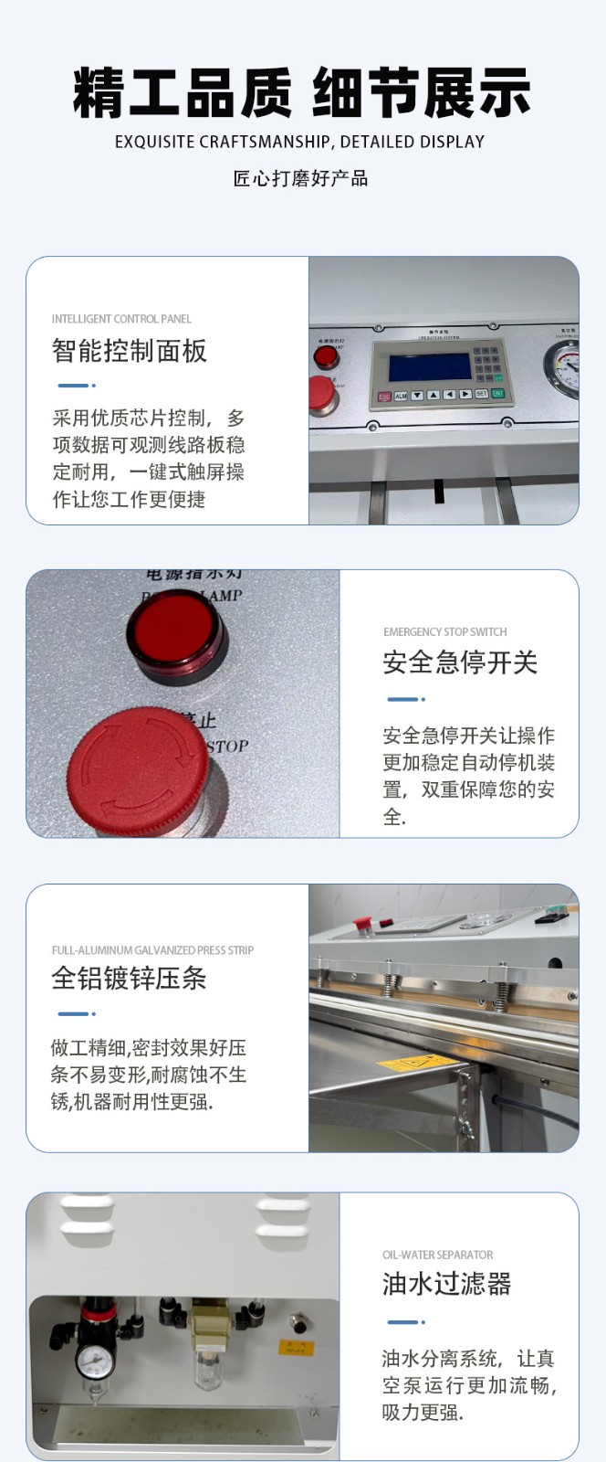• 放入空白包裝袋,進(jìn)行真空封口測試,檢查封口是否平整、無漏封、無焦糊(若封口不牢,可適當(dāng)調(diào)整溫度;若焦糊,需降低溫度或時間)。