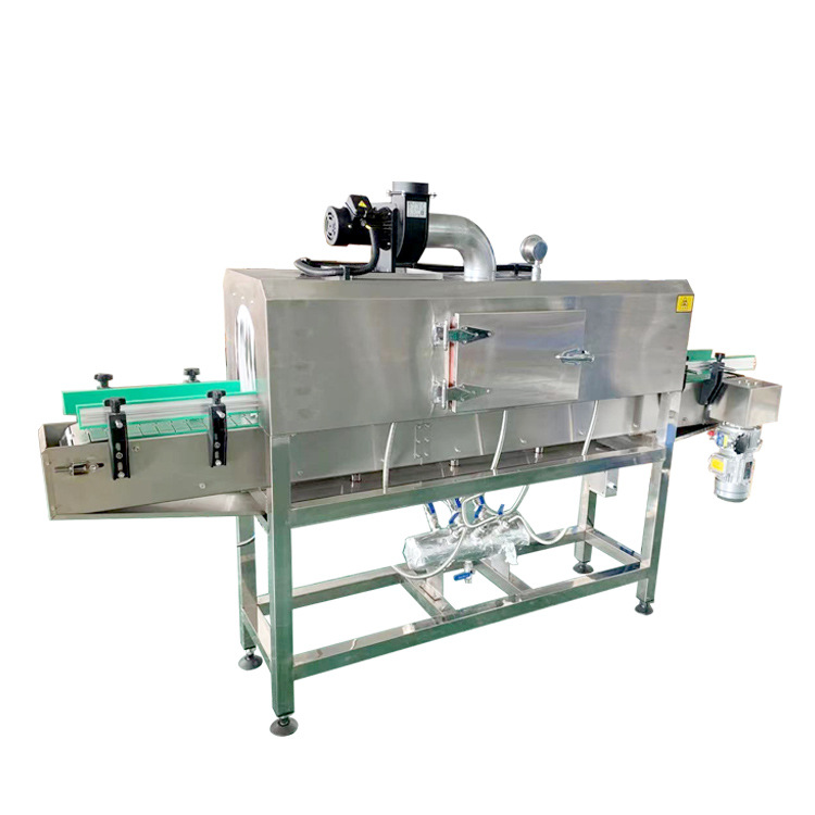 - 物品輸送方式:蒸汽收縮機采用勻速的輸送網(wǎng)帶或輸送鏈來傳送包裝物品通過收縮腔室。這樣可以保證物品在收縮過程中以穩(wěn)定的速度經(jīng)過蒸汽作用區(qū)域,每個部位接受蒸汽加熱的時間基本相同,從而避免了因停留時間不同而導(dǎo)致的收縮不均勻問題。