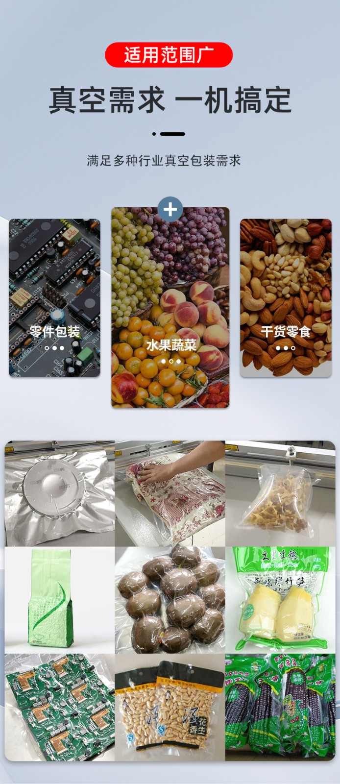 - 工業(yè)領(lǐng)域:可真空包裝大型機(jī)械零件(防銹)、整箱電子元件(防塵),部分機(jī)型支持調(diào)節(jié)抽真空力度,避免損壞精密組件。