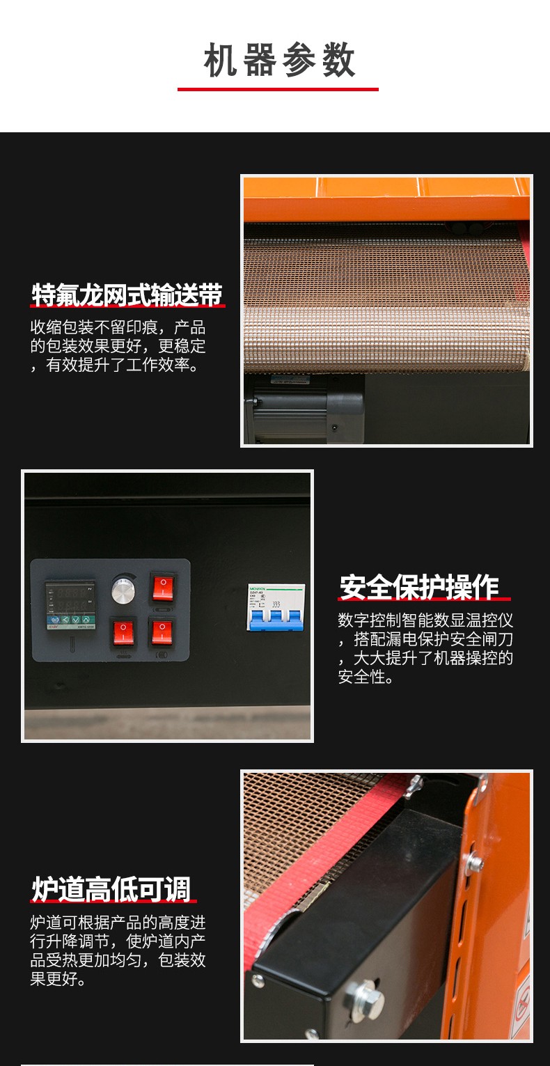 - 石英管加熱式熱收縮機(jī):利用石英加熱管產(chǎn)生的紅外線輻射來加熱薄膜。石英管加熱速度快,熱效率高,能夠在短時(shí)間內(nèi)使薄膜達(dá)到收縮溫度。它適用于對(duì)包裝速度要求較高的場(chǎng)合,比如在飲料瓶的批量包裝中,能夠快速完成包裝流程。